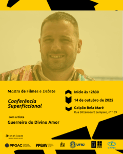 Conferência Superficcional com artista Guerreiro do Divino Amor Nesta conferência serão apresentados os seis primeiros filmes da Saga “Atlas Superficcional Mundial” seguido de uma conversa onde o Guerreiro do Divino Amor conta sobre os processos de pesquisa e construção das alegorias superficcionais, além de um diálogo com o cineasta Diego Paulino sobre fantasia e ficção